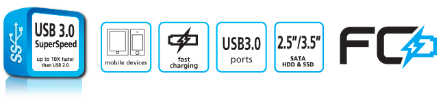 增加一个USB 数据及快充端口,适用于行动设备。• 时尚小巧设计• 连接简易,适合于2.5"&3.5" SATA硬盘 / 固态硬盘• 增加一個高效能USB 快充端口(最高2.4A) ,适用于行动设备• 符合 USB battery charging规范